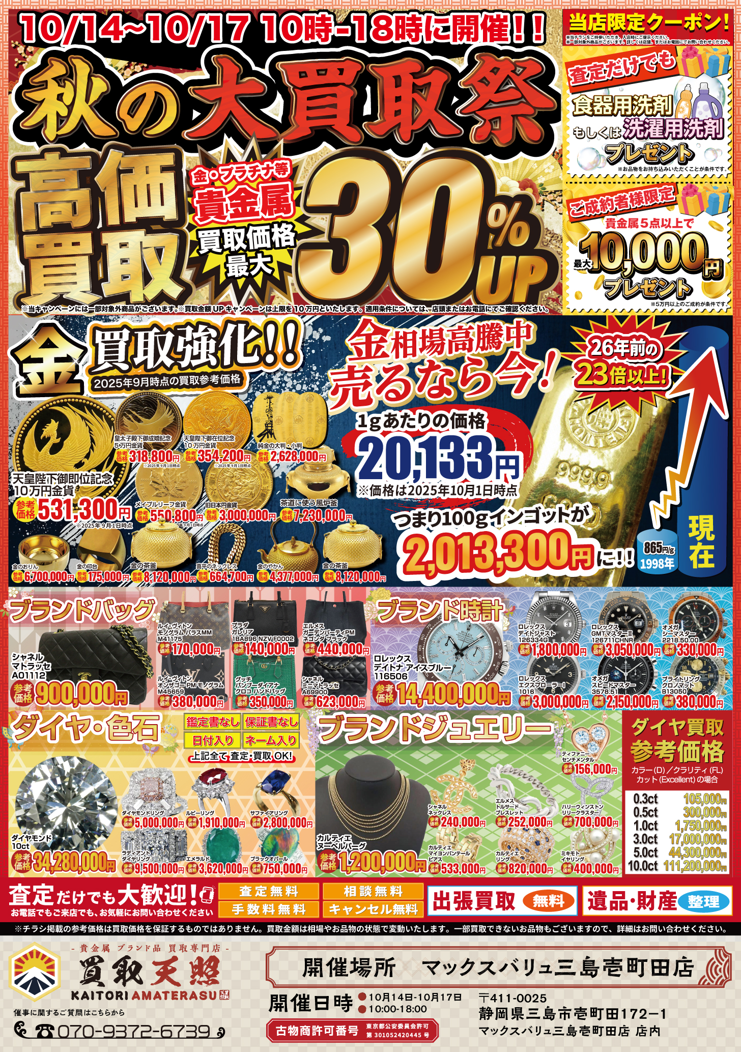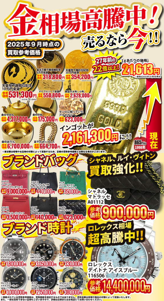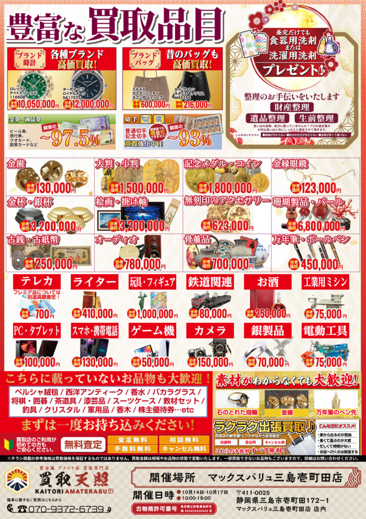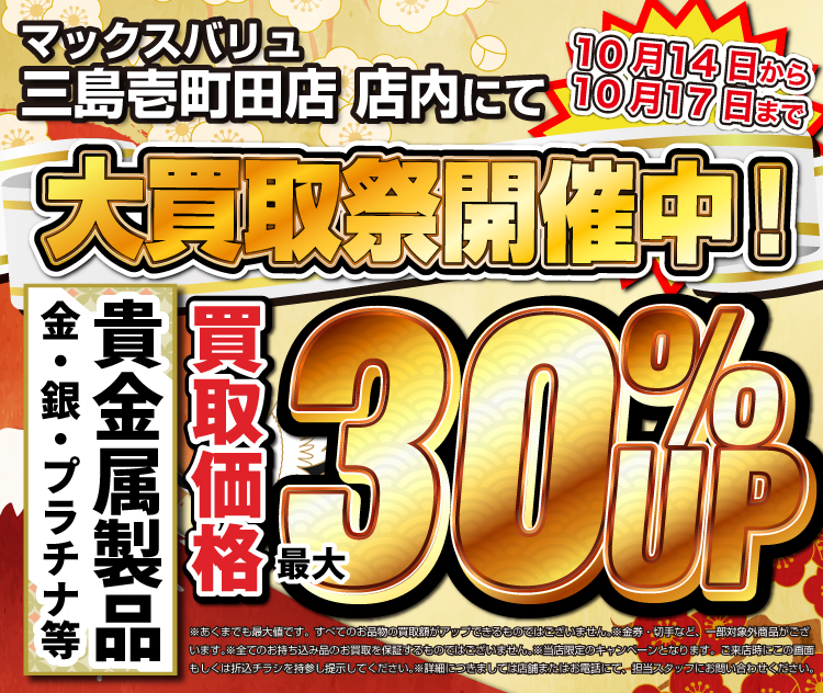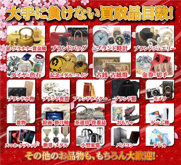 買取祭開催店舗情報 よくあるご質問 買取価格は主にどんな要素から決まるのでしょうか? お品物の状態や付属品の有無、最新相場、流通量などによって買取価格を算出します。 どんなものを買い取ってもらえますか? 金・貴金属・ブランド品はもちろん、お値段がつくか迷われているものも是非お持ちください。 傷や汚れのあるアイテムでも買取可能ですか? 大歓迎です。未使用品などのお持ち込みは少なく、傷や汚れのあるアイテムをお持ちいただく方が半数以上です。状態の悪いお品物やカビなどがあっても買取可能なケースもございます。 どんな情報があればすぐに査定額を教えてもらえますか? お品物の名前や種類、状態、またはブランド名、型番などの情報があると、概ねの査定額をお伝えできるかと思います。 査定時間はどのくらいですか? お品物の種類や個数にもよりますが、約5分から30分ほどの査定時間となるケースが多いです。事前にある程度の査定時間をお伝えいたしますので、ご安心ください。